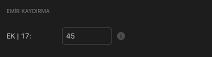 | EK | 17: | Saat 17:00’den sonra kaçıncı dakikadan sonra gelen emirlerin ertesi güne kaydırılmasını ayarlar. (Varsayılan değer ile kullanıldığında saat 17:45 sonrası gelen tüm emirler ertesi güne kaydırılır.) | 45 |