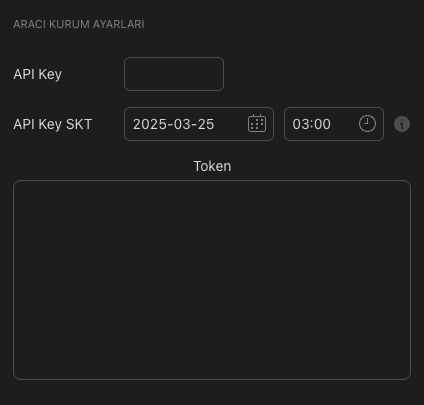 | Token | Aracı kurum entegrasyonu için token değeri. | Boş |
