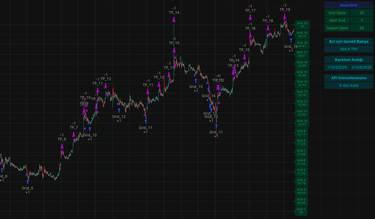Risk Uyarısı: BasicGrid stratejisi, fiyatın yukarı yönlü veya yatay hareket ettiği dönemlerde en verimli şekilde çalışır. Ancak, sürekli bir düşüş trendinde fiyat grid seviyelerinin altına sarkarsa ve yeni alım yapacak grid kalmazsa, yüksek zarar riski oluşabilir.