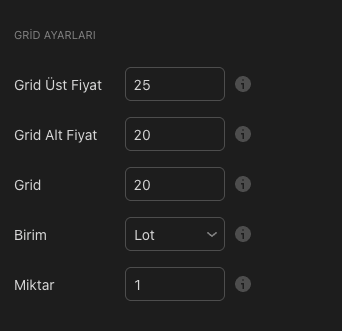 | Miktar | Her grid için kullanılacak alım-satım miktarını belirler. “Birim” parametresine göre Lot veya Fiyat cinsinden değerlendirilir. | 1 |